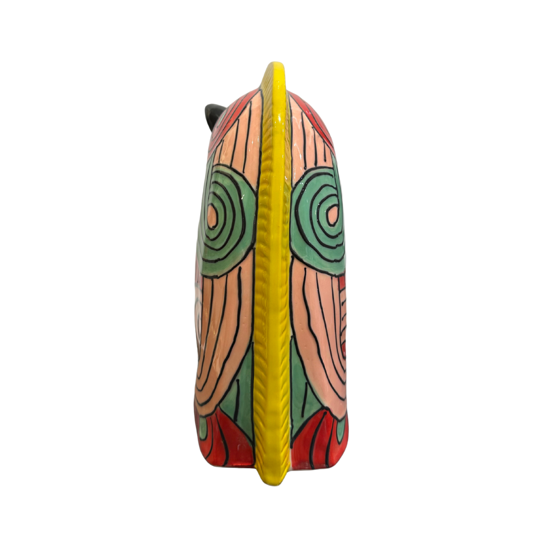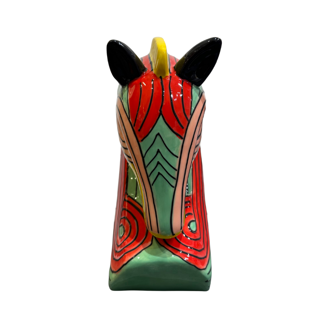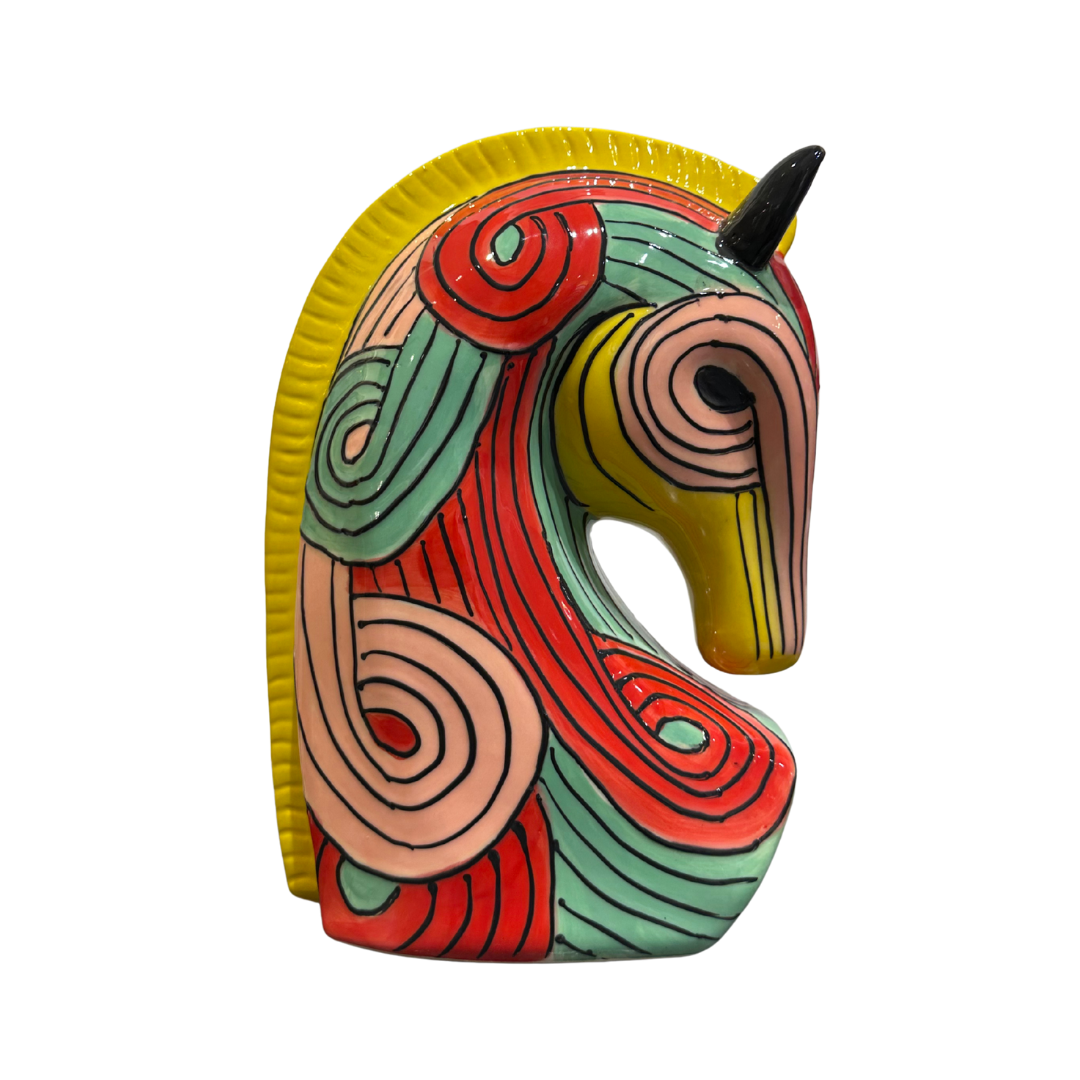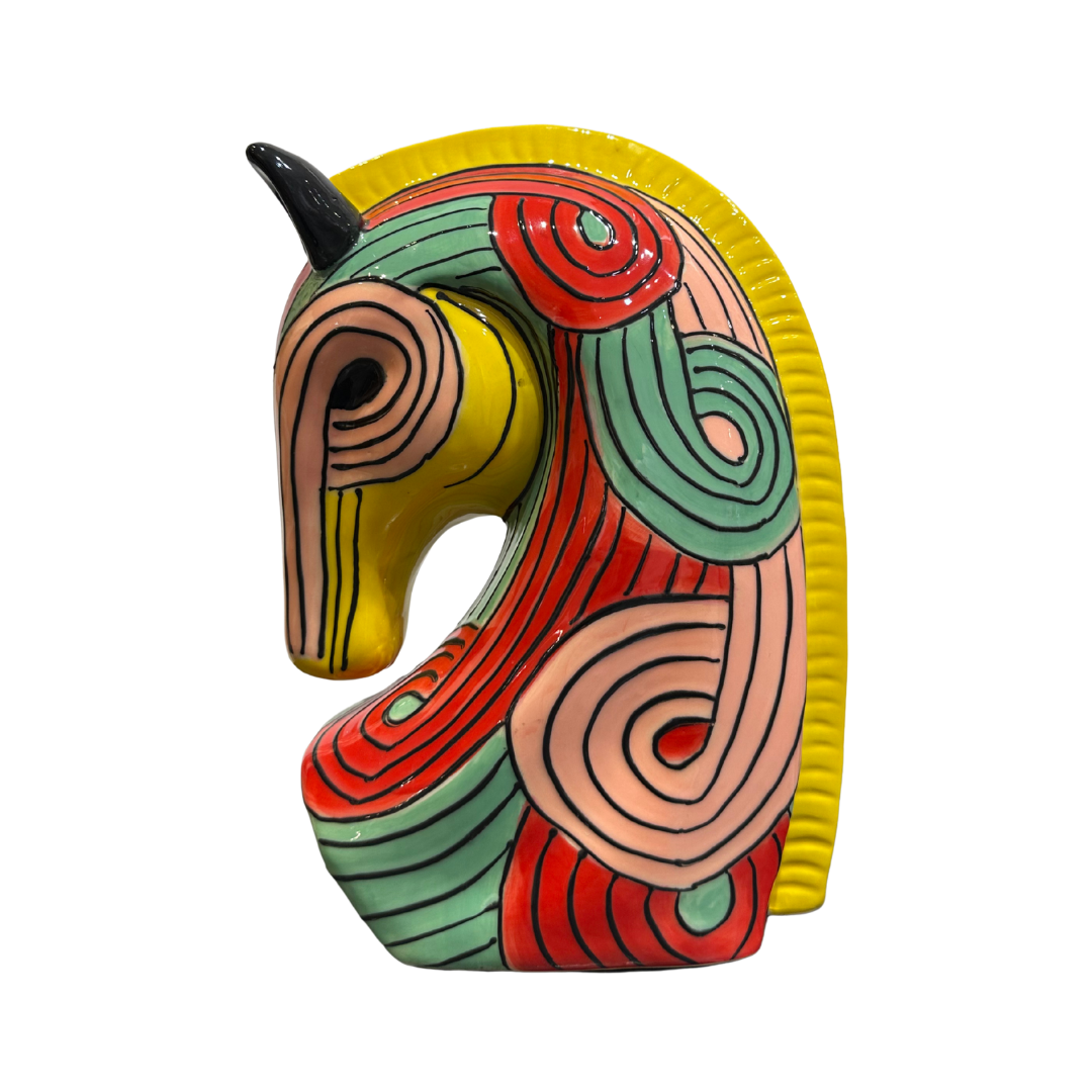 Une sculpture contemporaine qui réinterprète la tête de cheval sous une forme stylisée et expressive. Les motifs en spirales et les tracés noirs rappellent l’art moderne, créant un mouvement visuel continu qui donne vie à la pièce. La palette éclatante de rouge, vert, jaune et rose intensifie l’impact esthétique, tandis que la finition brillante met en valeur les lignes et les courbes.